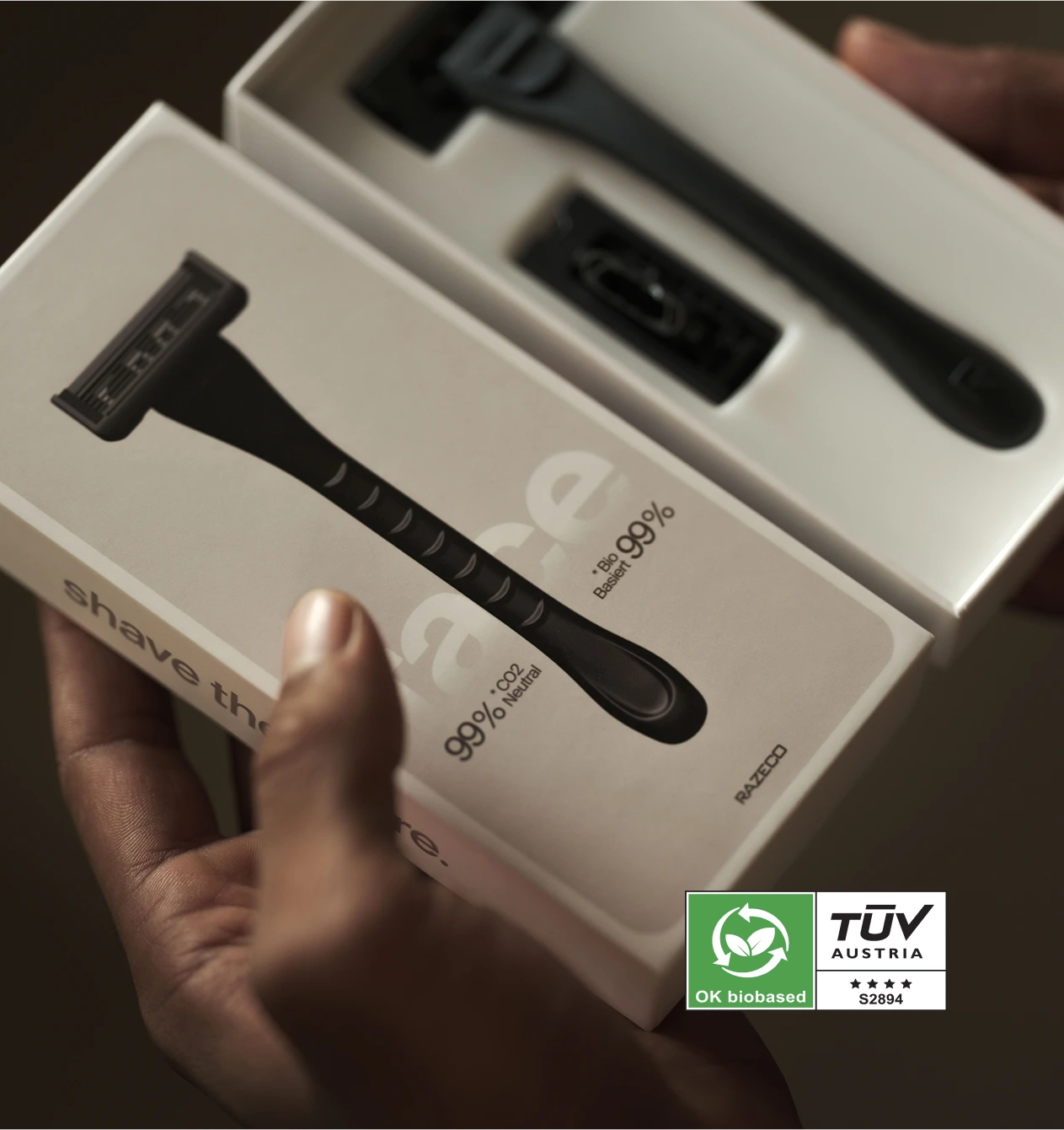 They’re 99% bio-based (certified!), and when thrown away, they create way less CO₂ than regular plastic razors.
