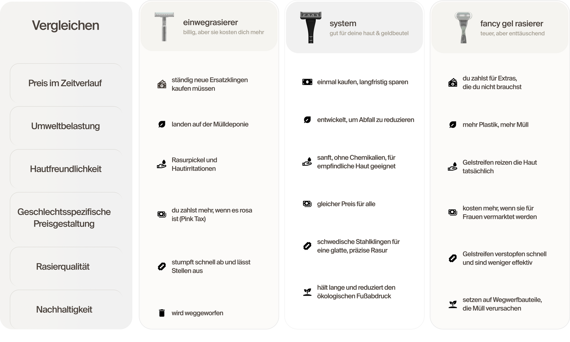 Das bedeutet, wir berechnen für alle den gleichen fairen Preis. Keine geschlechtsspezifischen Preisaufschläge, keine Tricks mit kitschigen Verpackungen. Einfach ein großartiger Rasierer zum richtigen Preis – für jede/n, der/die ihn kauft.
